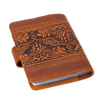 Шкіряна візитниця в теплому кольорі коньяк поєднує в собі елегантність та глибоку українську символіку. Об’ємне тиснення з тризубом, калиновими гронами та рослинними мотивами створює виразний орнамент, який одразу привертає увагу.