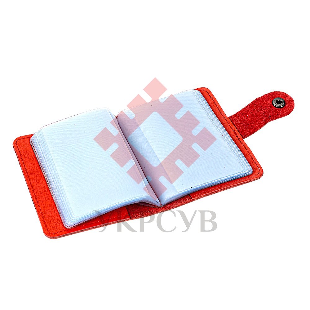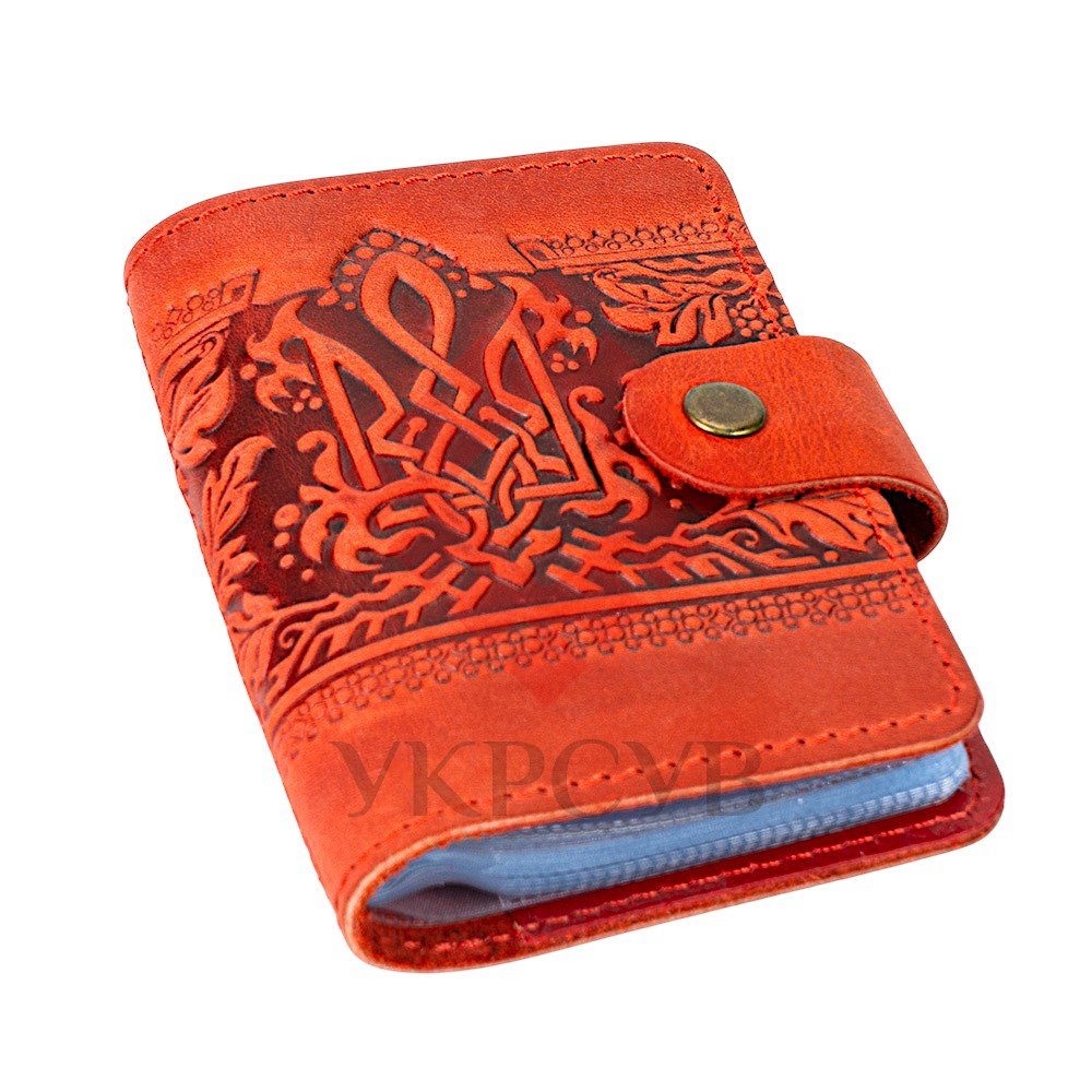 Червона шкіряна візитниця з тисненим тризубом і калиновим орнаментом — яскравий та символічний аксесуар, що одразу привертає увагу. Об’ємний візерунок із калиновими гронами, листям та плетеним тризубом виглядає особливо виразно на тлі насиченого червоного кольору.