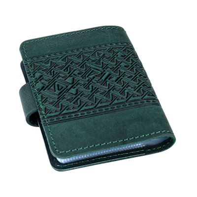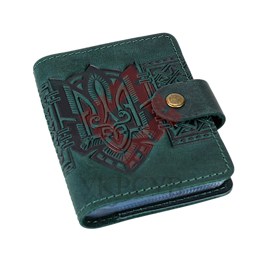 Стильна бірюзова візитниця зі шкіри стане яскравим акцентом у повсякденних аксесуарах. Глибоке тиснення з українським тризубом і геометричними орнаментами додає виробу характеру й виразності, а м'яка натуральна шкіра робить його приємним на дотик та довговічним.