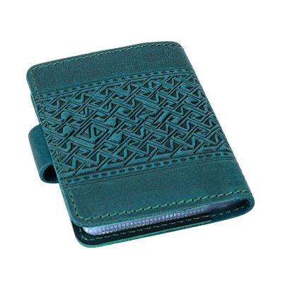 Стильна візитниця в кольорі бутилка — глибокому, насиченому зеленому відтінку — створена з натуральної шкіри та прикрашена тисненим тризубом у поєднанні з традиційними геометричними мотивами. Такий дизайн виглядає виразно, сучасно й водночас зберігає український характер.