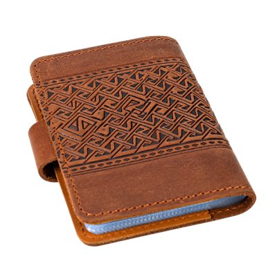 Шкіряна візитниця в кольорі коньяк поєднує елегантність натуральної фактури та символічність тисненого тризуба з геометричним орнаментом. Теплий відтінок шкіри надає аксесуару вишуканості, а акуратне прошиття підкреслює якість виконання.