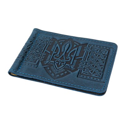Стильний та лаконічний зажим для грошей, створений зі справжньої шкіри, поєднує сучасний дизайн із глибокою українською символікою. Темно-синій колір надає виробу яскравості, а рельєфний візерунок із Тризубом і геометричними мотивами виглядає виразно та елегантно.