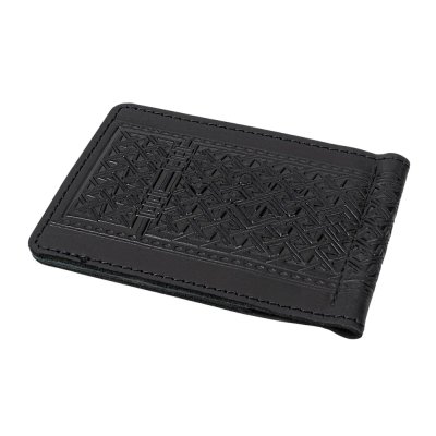 Стильний та лаконічний зажим для грошей, створений зі справжньої шкіри, поєднує сучасний дизайн із глибокою українською символікою. Чорний колір надає виробу яскравості, а рельєфний візерунок із Тризубом і геометричними мотивами виглядає виразно та елегантно.