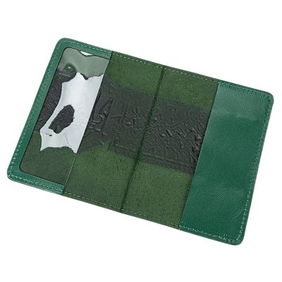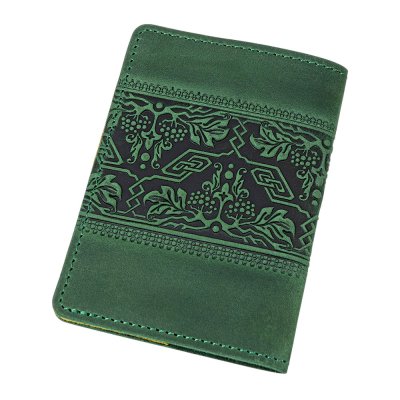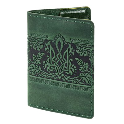 Зелена шкіряна обкладинка з тисненим тризубом і калиновим орнаментом — це стильний та символічний аксесуар, що захищає військовий квиток і водночас підкреслює українську ідентичність. Об’ємний візерунок із гронами калини, листям і плетеним тризубом виглядає виразно та додає виробу автентичного шарму.