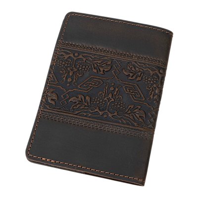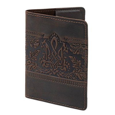 Темно-коричнева шкіряна обкладинка з тисненим тризубом і калиновим орнаментом — це стильний та символічний аксесуар, що захищає військовий квиток і водночас підкреслює українську ідентичність. Об’ємний візерунок із гронами калини, листям і плетеним тризубом виглядає виразно та додає виробу автентичного шарму.