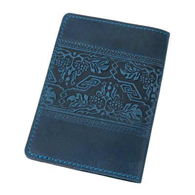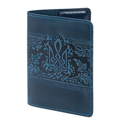 Темно-синя шкіряна обкладинка з тисненим тризубом і калиновим орнаментом — це стильний та символічний аксесуар, що захищає військовий квиток і водночас підкреслює українську ідентичність. Об’ємний візерунок із гронами калини, листям і плетеним тризубом виглядає виразно та додає виробу автентичного шарму.