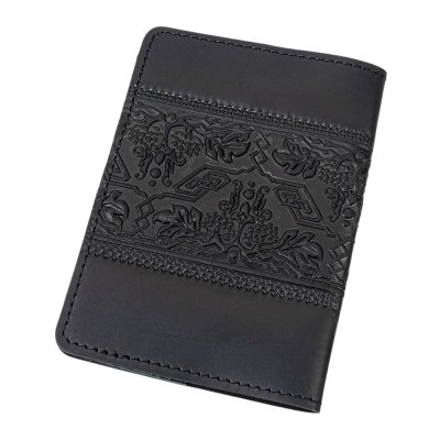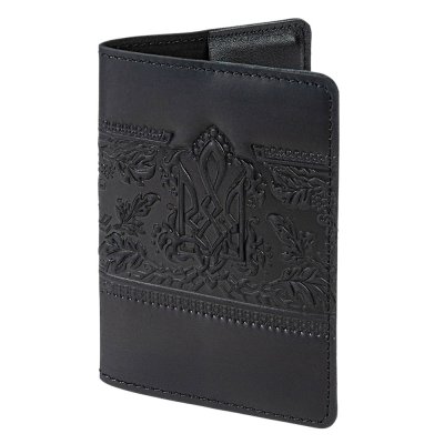 Чорна шкіряна обкладинка з тисненим тризубом і калиновим орнаментом — це стильний та символічний аксесуар, що захищає військовий квиток і водночас підкреслює українську ідентичність. Об’ємний візерунок із гронами калини, листям і плетеним тризубом виглядає виразно та додає виробу автентичного шарму.
