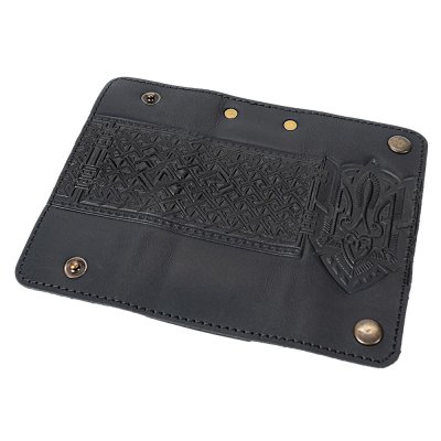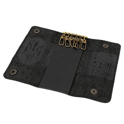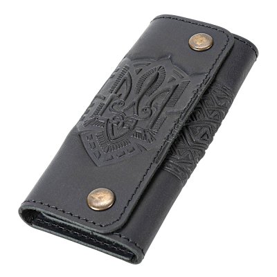 Стильна шкіряна ключниця у глибокому чорному кольорі доповнена виразним тисненням з поєднанням тризуба та геометричного орнаменту. Такий аксесуар виглядає солідно та водночас сучасно, надаючи щоденним речам національного характеру й індивідуальності.