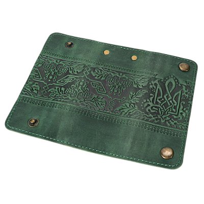 Стильна ключниця з натуральної шкіри, створена для тих, хто цінує символіку та український характер у щоденних речах. Бірюзовий колір додає виробу глибини, а тиснений візерунок із Тризубом та калиновою гілкою підкреслює його автентичність.