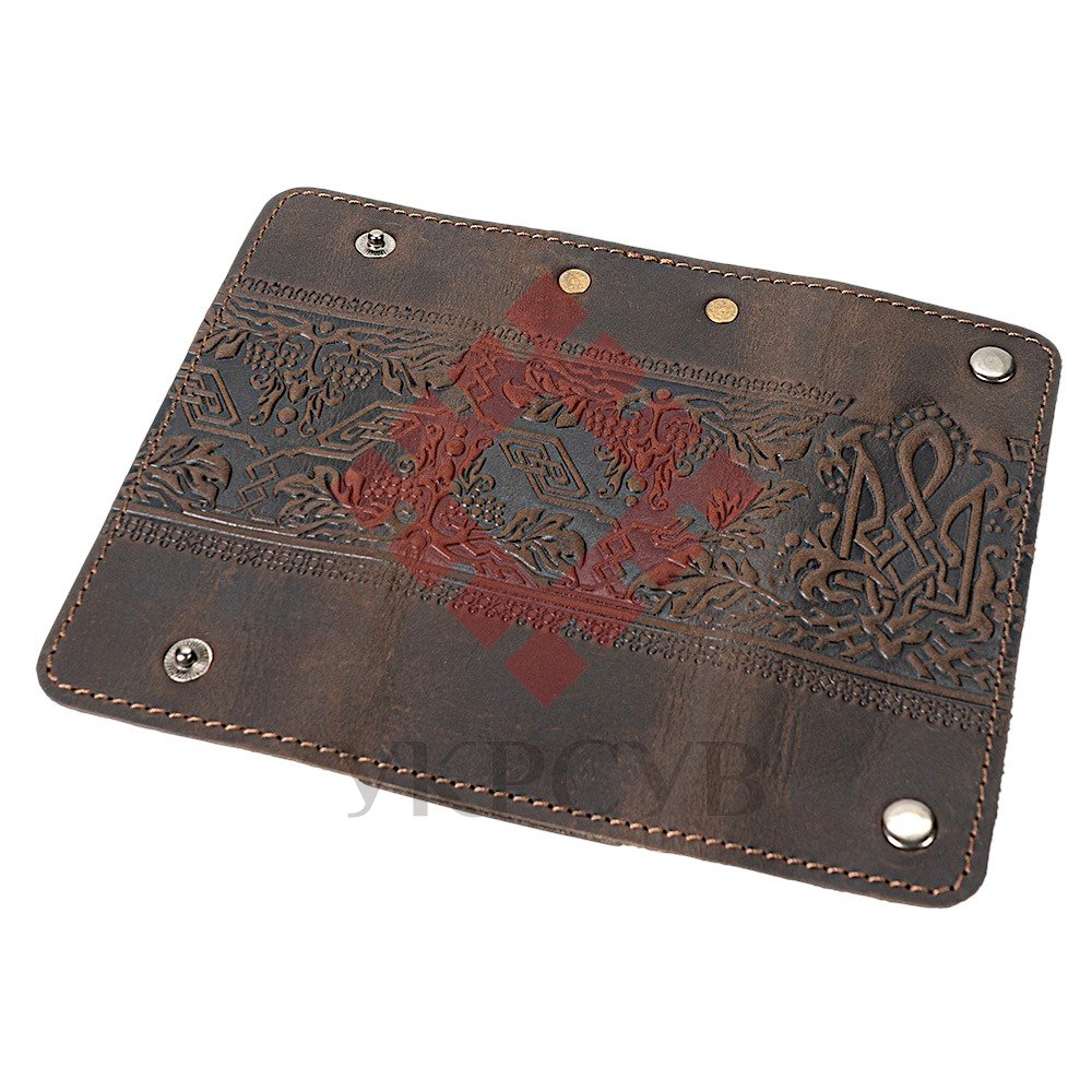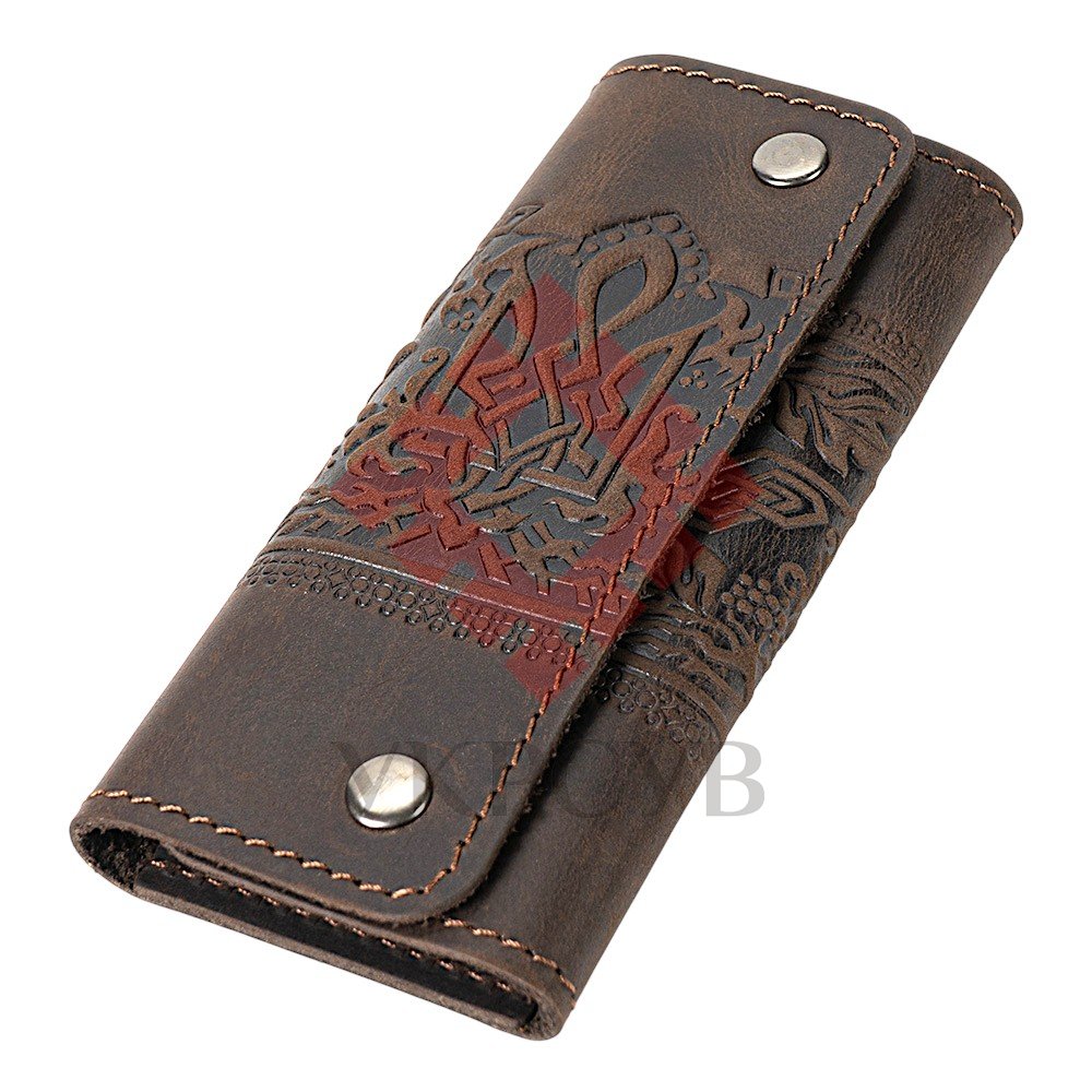Стильна ключниця з натуральної шкіри, створена для тих, хто цінує символіку та український характер у щоденних речах. Темно-коричневий колір додає виробу глибини, а тиснений візерунок із Тризубом та калиновою гілкою підкреслює його автентичність.