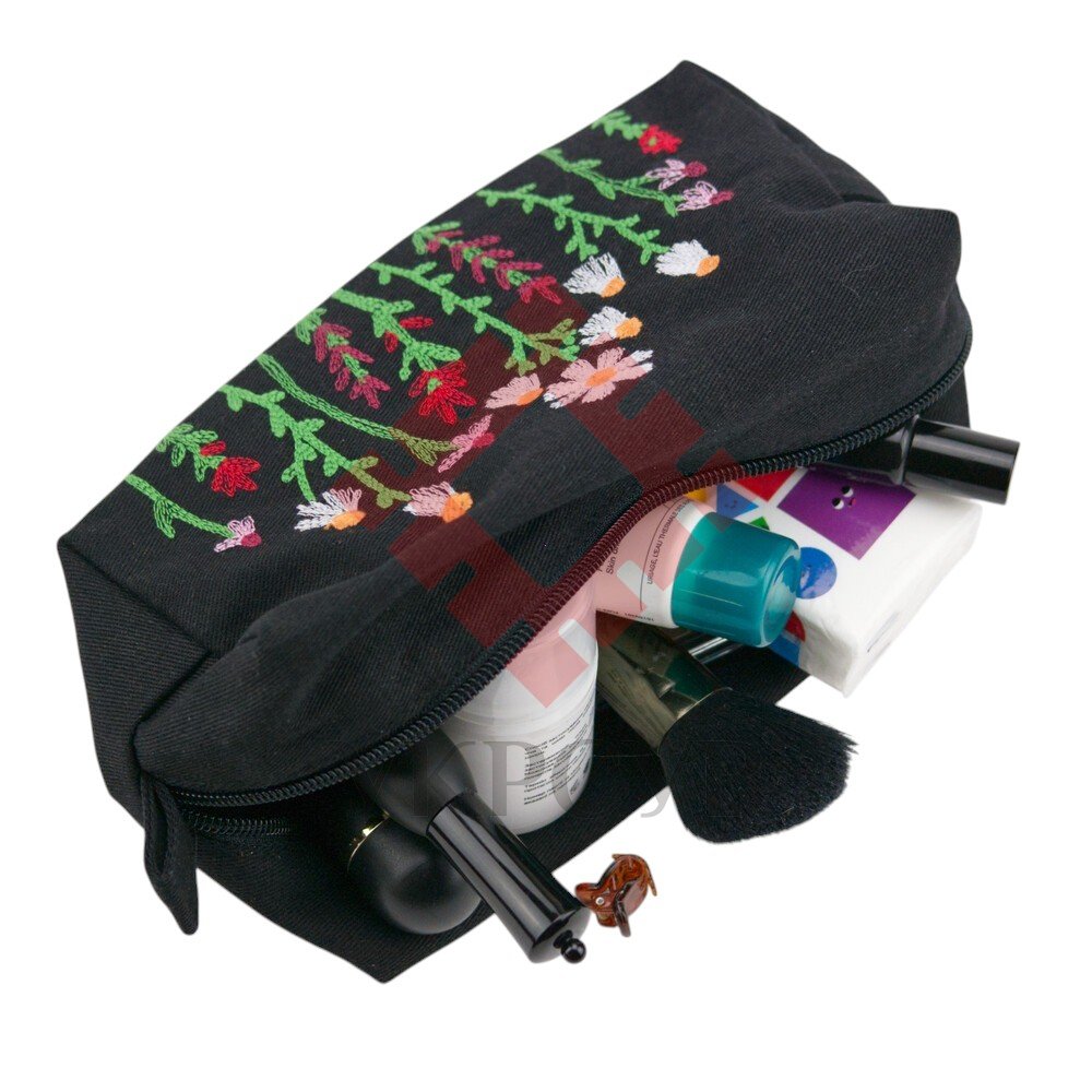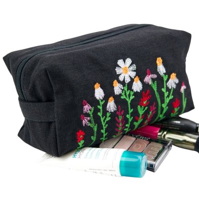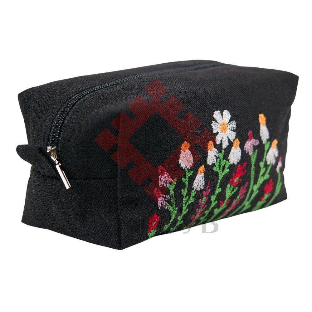 Модель має зручну прямокутну форму та компактний, але місткий розмір. Акуратна вишивка з ромашками та польовими квітами надає виробу живого, натхненного настрою. Усередині — якісна бавовняна підкладка, що забезпечує приємність у використанні та захищає вміст. Міцна блискавка робить косметичку надійною навіть при активному щоденному користуванні.