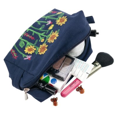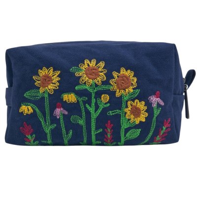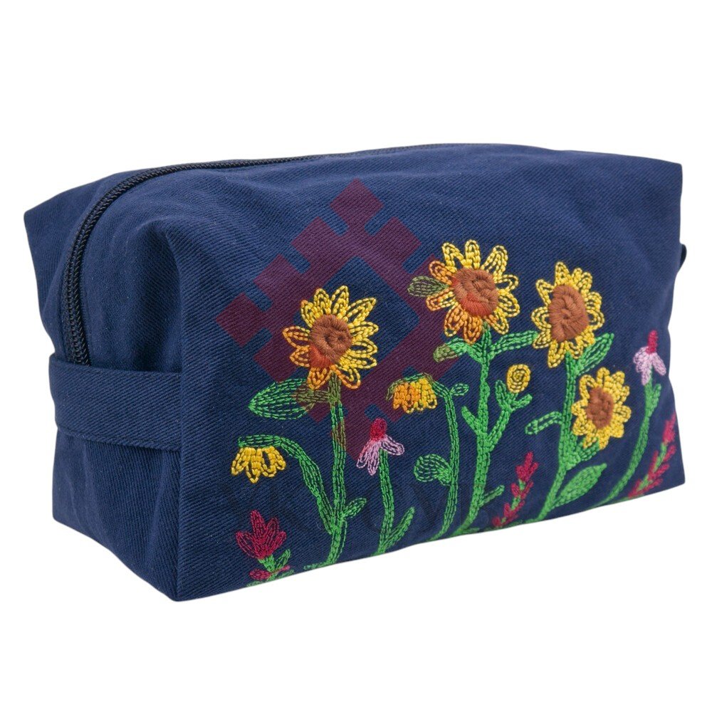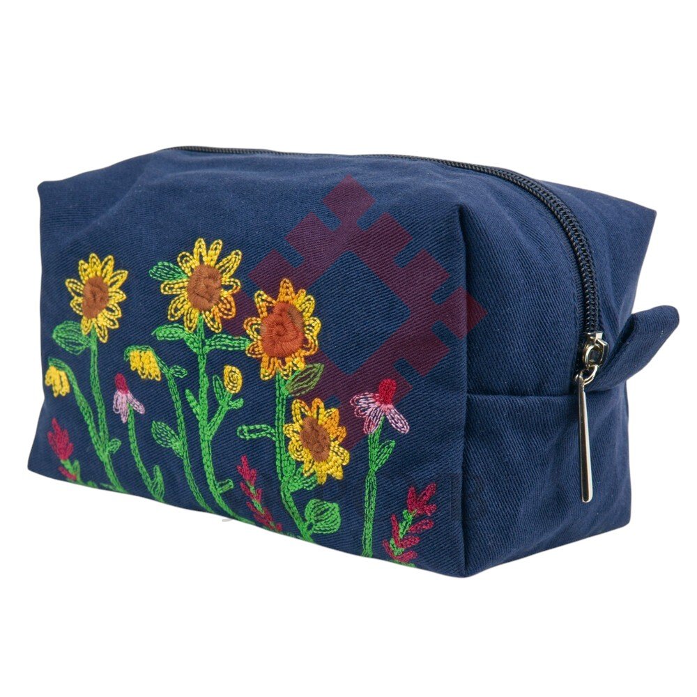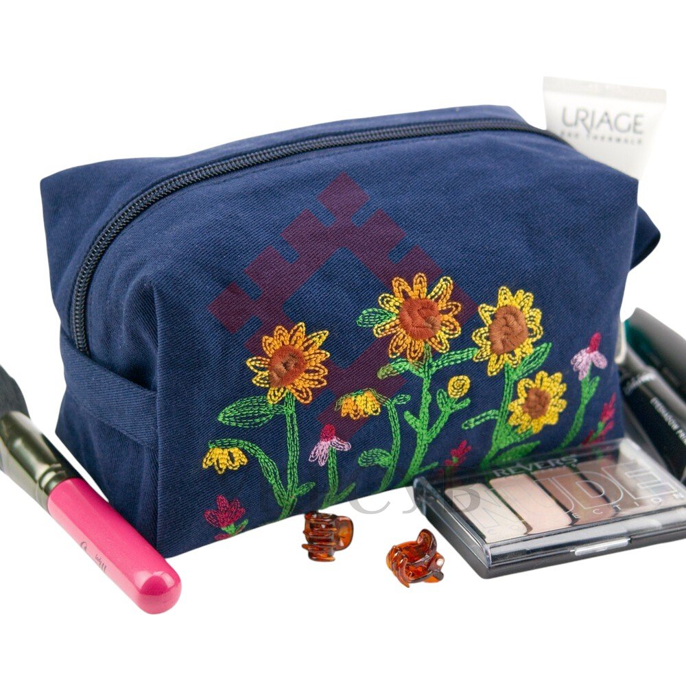 Вишита косметичка — це яскравий аксесуар, створений для тих, хто любить поєднання практичності та декоративності. Насичений синій колір тканини чудово відтінює вишиті соняхи й польові квіти, роблячи дизайн особливо виразним і життєрадісним.