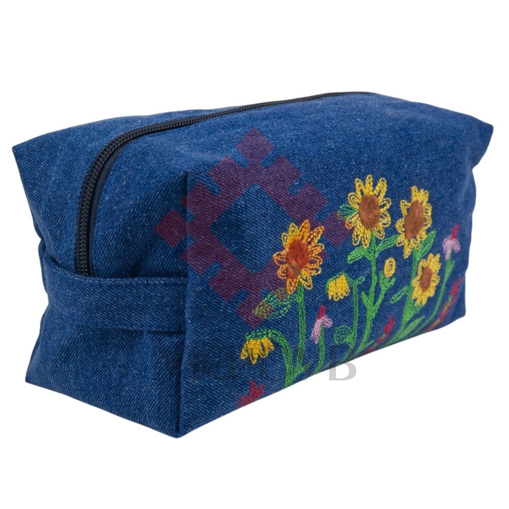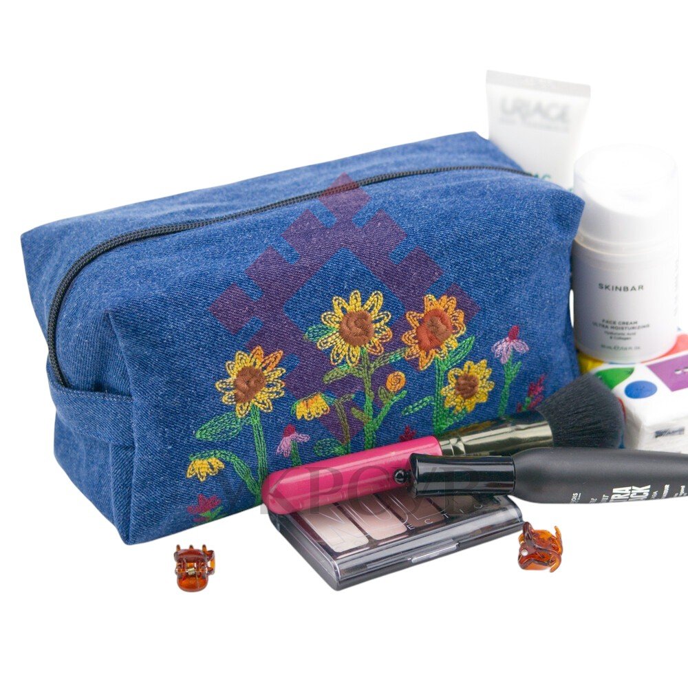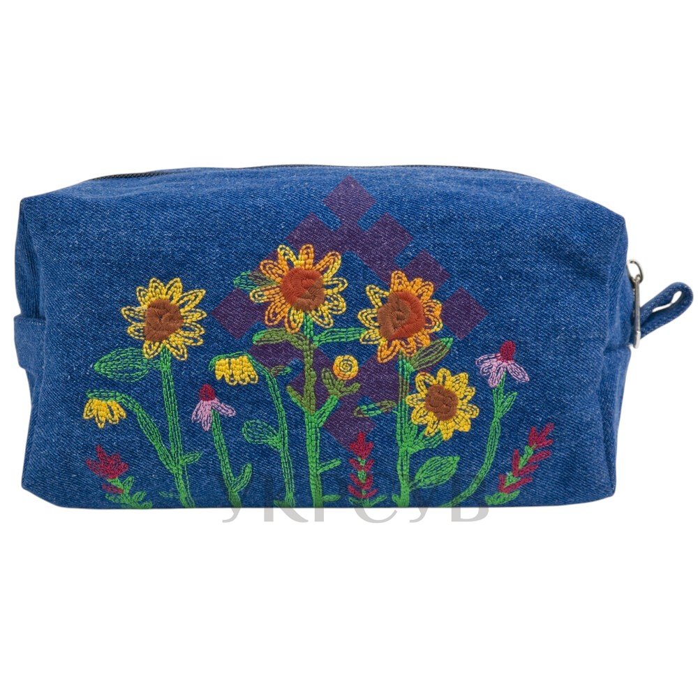 Вишита косметичка — яскравий та практичний аксесуар, який поєднує натуральність джинсової тканини та теплоту українських мотивів. Глибокий синьо-бірюзовий відтінок чудово підкреслює вишивку соняхів і польових квітів, роблячи дизайн живим, виразним і по-справжньому літнім.