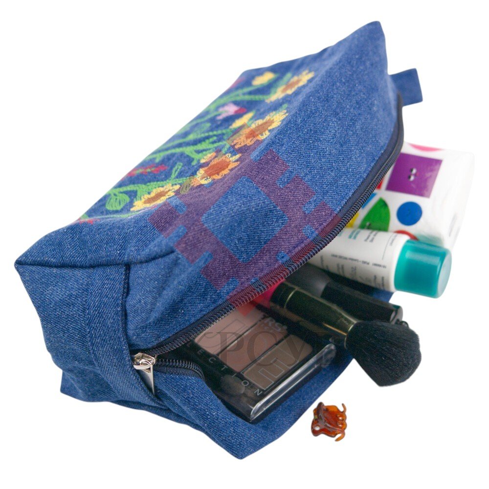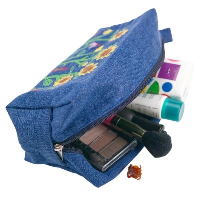 Модель має компактну, але дуже містку прямокутну форму, що дозволяє зручно розмістити косметику, доглядові засоби та інші потрібні дрібниці. Натуральна підкладка та міцна застібка-блискавка забезпечують комфорт у щоденному використанні, а щільний джинс допомагає косметичці добре тримати форму.