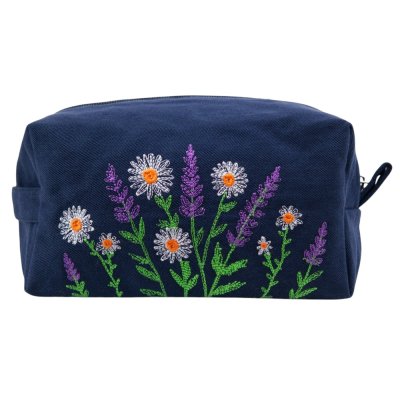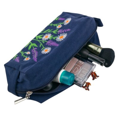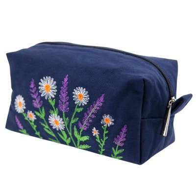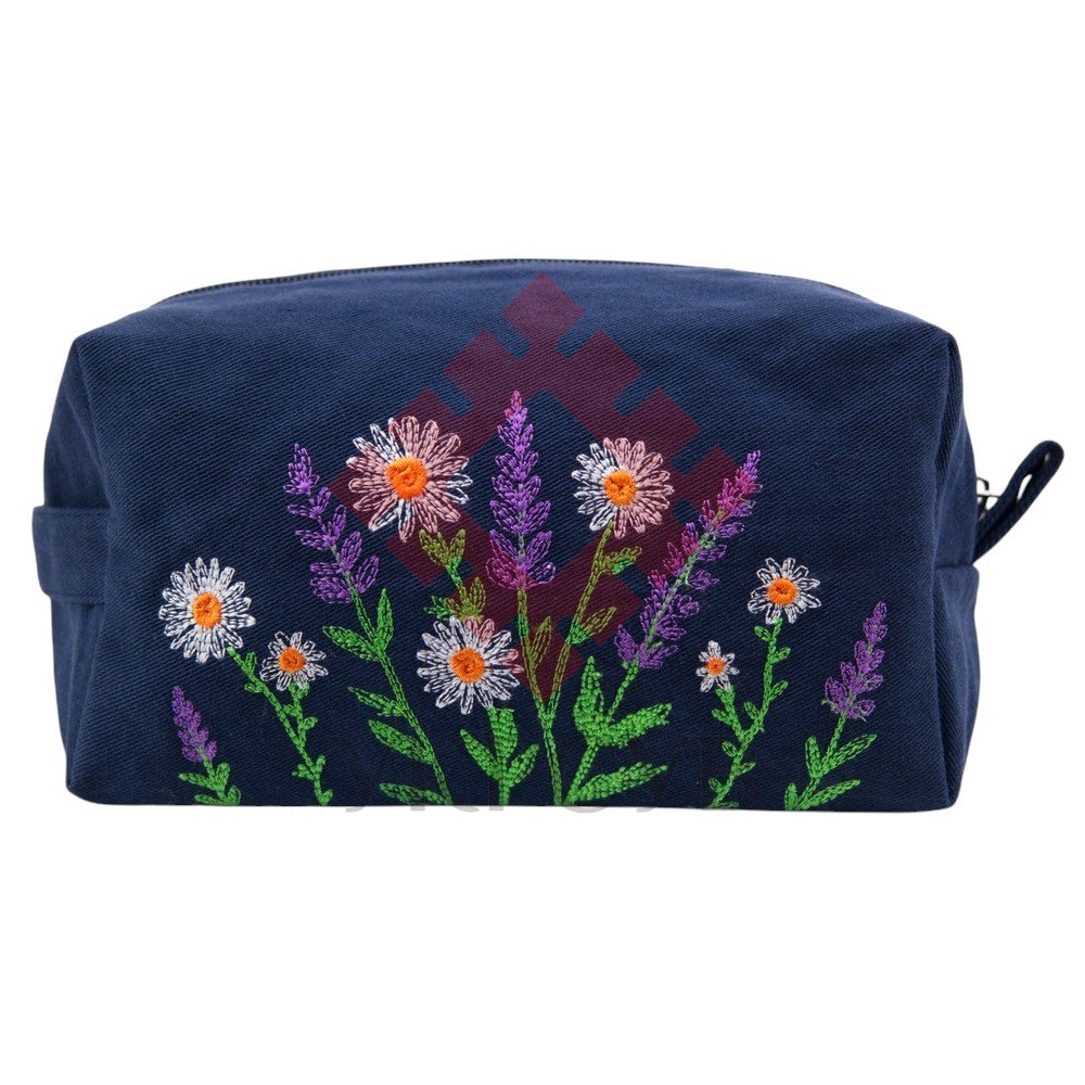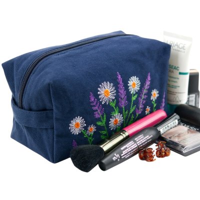 Вишита косметичка — це поєднання глибокого синього кольору та ніжної квіткової вишивки, що створює відчуття легкості й природної гармонії. Ромашки та гілочки лаванди формують яскравий, але водночас дуже ніжний візерунок, який робить аксесуар по-справжньому унікальним.
