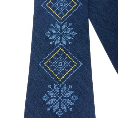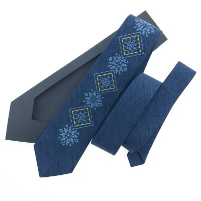 Модель виконана з якісної тканини з гладкою фактурою, приємною на дотик та стійкою до зношування. Добре продумана довжина дозволяє зав’язувати різні види вузлів, а насичений синій колір додає аксесуару статусності. Вишивка нанесена акуратно та рівномірно, зберігаючи чіткість кожного елементу орнаменту.