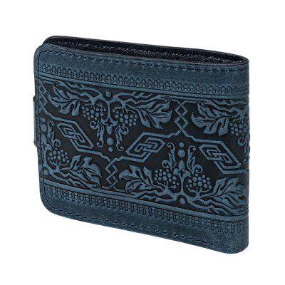 Стильний та лаконічний гаманець із натуральної шкіри, створений для поціновувачів української символіки та сучасної практичності. Темно-синій колір надає виробу індивідуальності, а витончене тиснення з мотивом калини та тризуба підкреслює національний характер аксесуара.