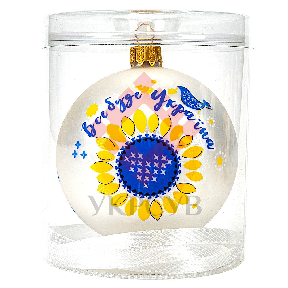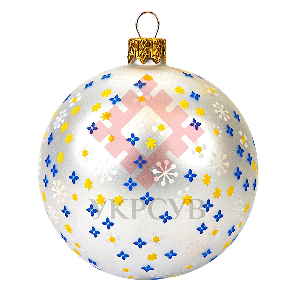 Синьо-жовта кольорова гама, доповнена декоративними елементами та легким орнаментальним розписом, створює відчуття гармонії й радості. Світлий матовий фон підкреслює яскравість композиції, а класична форма кульки робить її універсальною для будь-якого новорічного декору.