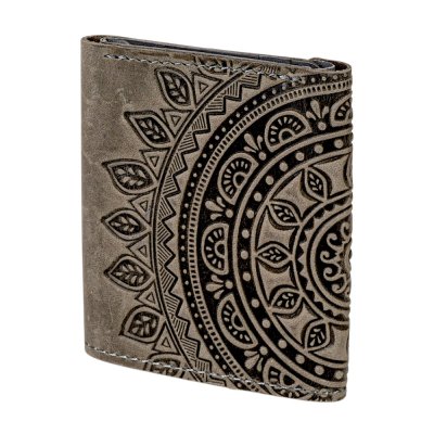 Компактний шкіряний гаманець з виразним етнічним орнаментом — стильний акцент для тих, хто цінує українську символіку та мінімалізм. Глибоке тиснення у вигляді сонячного етно-візерунку додає виробу характеру та об’ємності, підкреслюючи ручну майстерність виконання.
