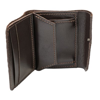 Натуральна шкіра приємна на дотик, злегка матова, з ефектом вінтажу. Акуратний шов контрастною ниткою підкреслює форму, а компактний розмір робить гаманець зручним для щоденного використання — він легко поміщається в кишені чи невеликій сумці.