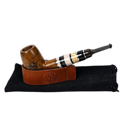 У комплект входять практичні аксесуари — замшевий чохол для зберігання та шкіряна підставка, яка дозволяє красиво розмістити люльку на столі. Це не лише функціональний аксесуар для поціновувачів тютюну, а й стильний подарунок для тих, хто цінує ручну роботу та естетику натуральних матеріалів.