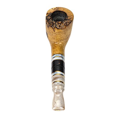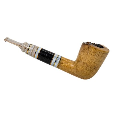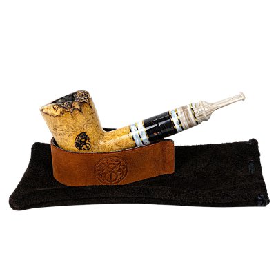 Особливістю цієї люльки є ефектна верхня частина чаші з природною текстурою капу, яка створює враження природної скульптури. Мундштук виконаний з акрилу та штучного каменю, а декоративні вставки формують стильний контраст світлих і темних елементів. Конструкція передбачає використання стандартного фільтра 8 мм, що забезпечує комфортне та м’яке куріння.