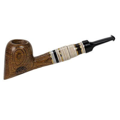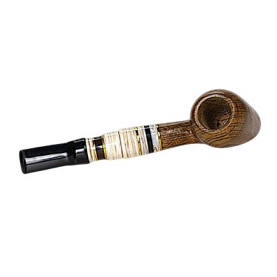 Елегантна люлька для куріння ручної роботи, виготовлена з мореного дуба — благородної деревини з виразною природною текстурою. Чаша має компактну, гармонійну форму з красивим малюнком річних кілець, що підкреслює натуральне походження матеріалу. Поверхня покрита карнаубським воском, який надає дереву м’якого блиску, захищає його та підкреслює природну красу дуба.