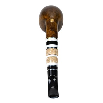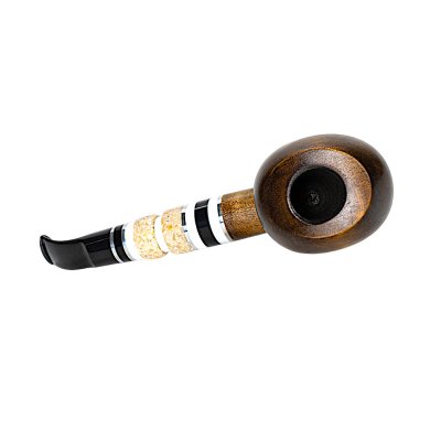 Мундштук виготовлений із акрилу та штучного каменю з декоративними вставками світлого відтінку, що створюють ефектний контраст із темним деревом. Такий дизайн виглядає вишукано та сучасно, перетворюючи люльку на стильний аксесуар. Конструкція передбачає використання стандартного фільтра 8 мм, що забезпечує більш м’яке та комфортне куріння.
