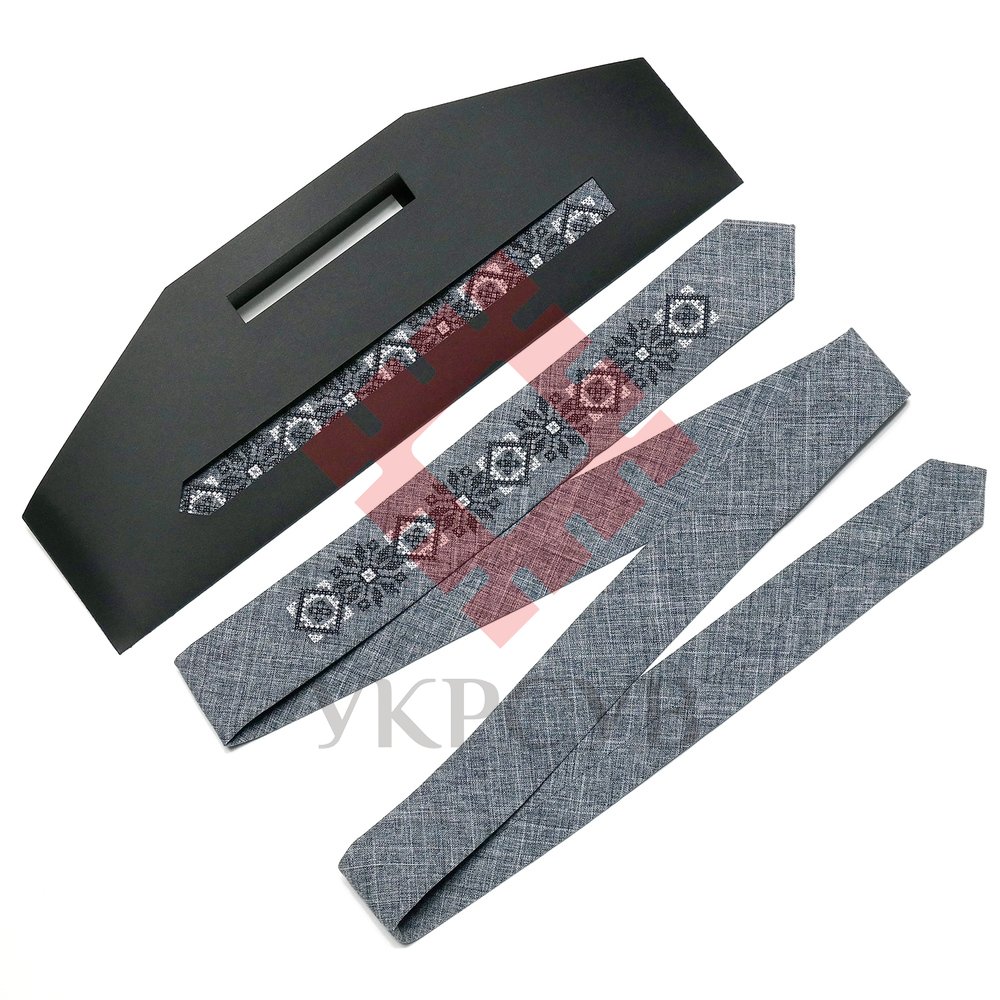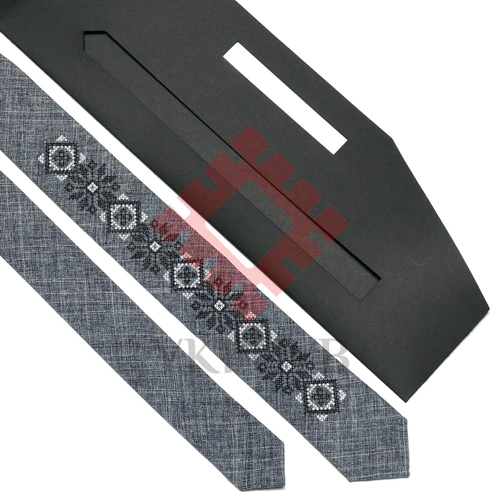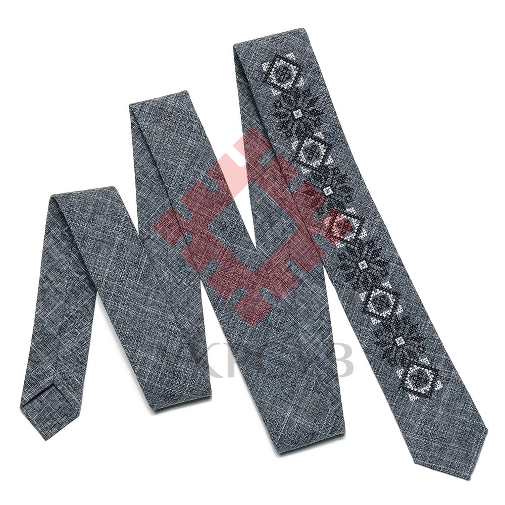 Вузька вишита краватка №754 – це унікальний подарунок для боса, друга чи колеги по роботі. Вузька вишита краватка – це необхідний аксесуар для ділової людини. Матеріал краватки – костюмна тканина сірого кольору. Довжина виробу – 145см.
