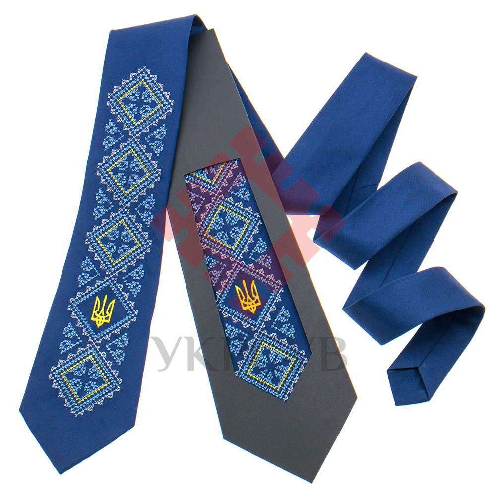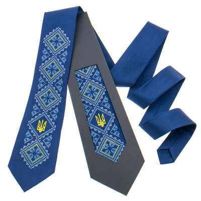 Вишита краватка з тризубом №820 – це не просто український сувенір, який може бути гарним подарунком. Краватка – це необхідний аксесуар для ділової людини. Матеріал краватки - матовий сатин синього кольору. Довжина виробу: 145 см, ширина: 9см