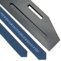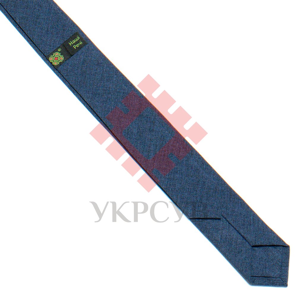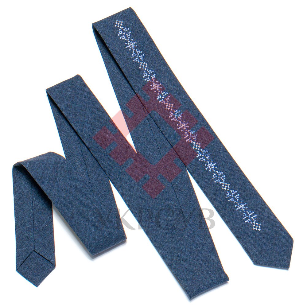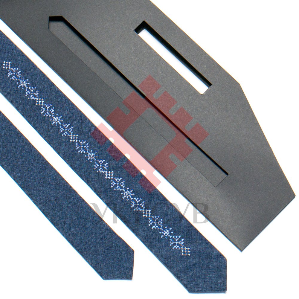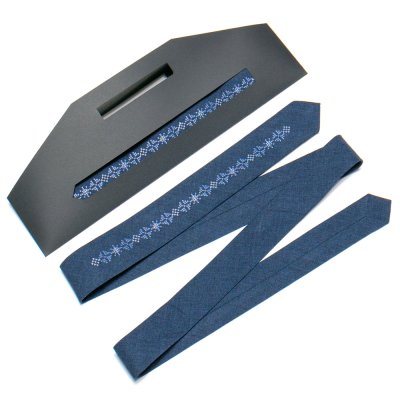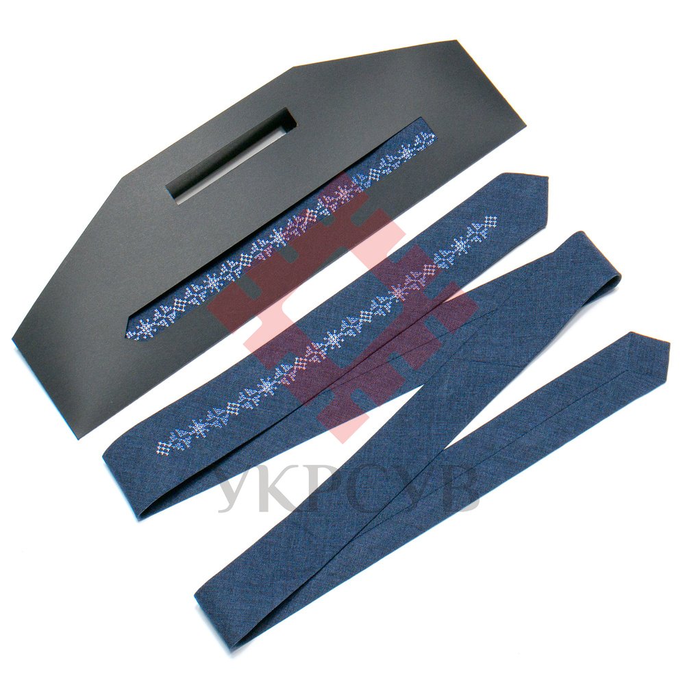 Краватка виконана у фірмовій техніці з костюмної тканини темно-синього та блакитного кольорів. Розмір: 145 х 7 см. Усі вузькі вишиті краватки нашого виробництва – запаковані в чорну фірмову упаковку ручної роботи, що змодельована саме для данного виробу. Упаковка виготовлена вручну з дизайнерського картону.