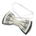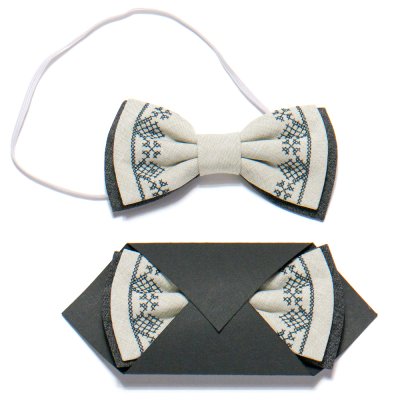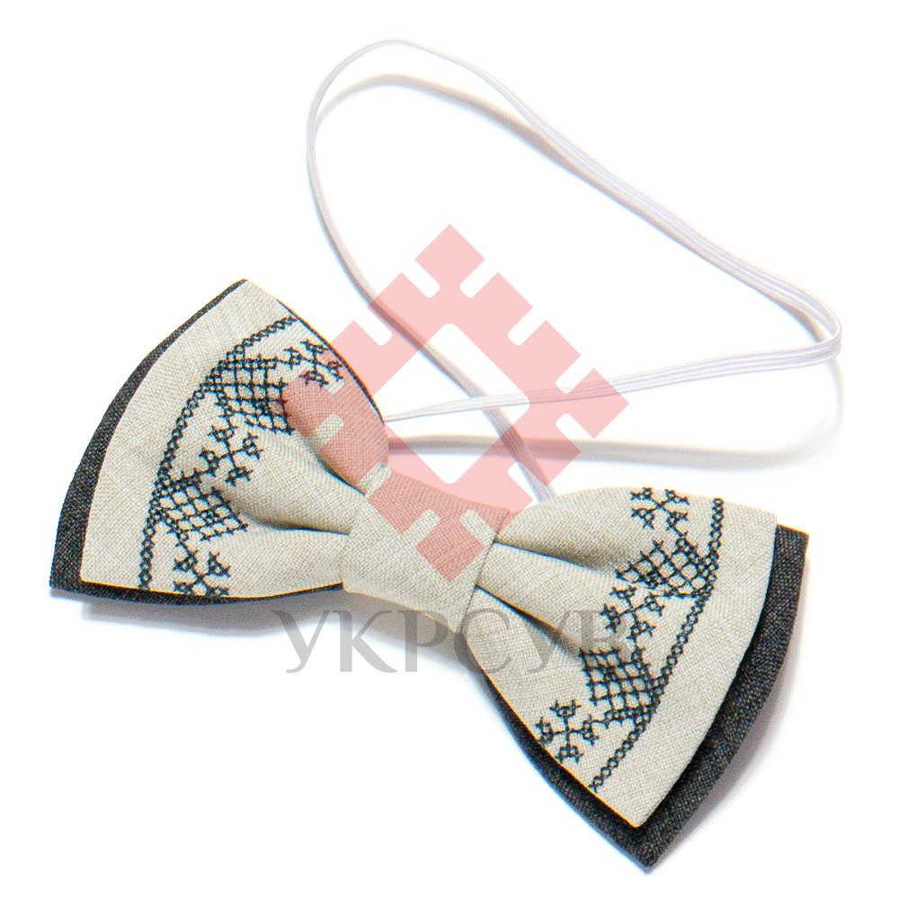 Дитячий вишитий метелик №730. Метелик виготовлений із комбінованої костюмної тканини сірого кольору. Має дуже простий спосіб кріплення на резинці, що запросто підійде для найменшеньких.