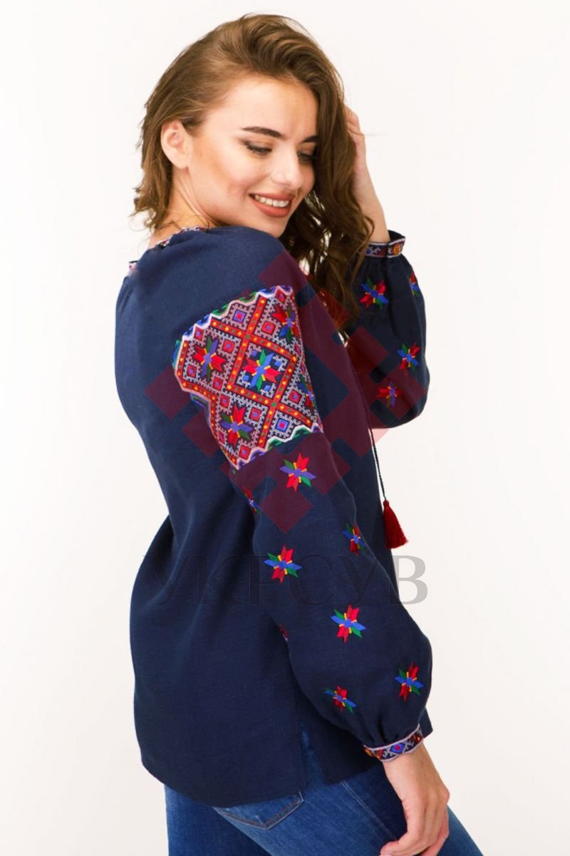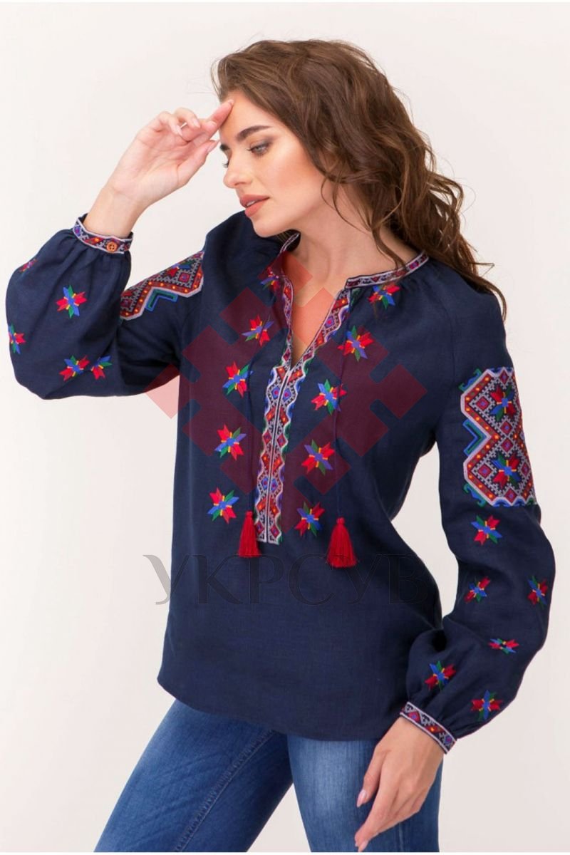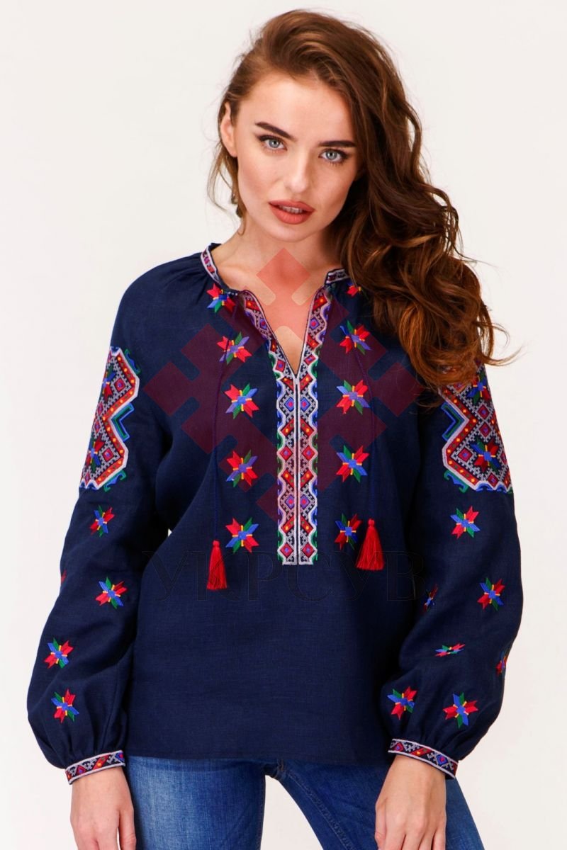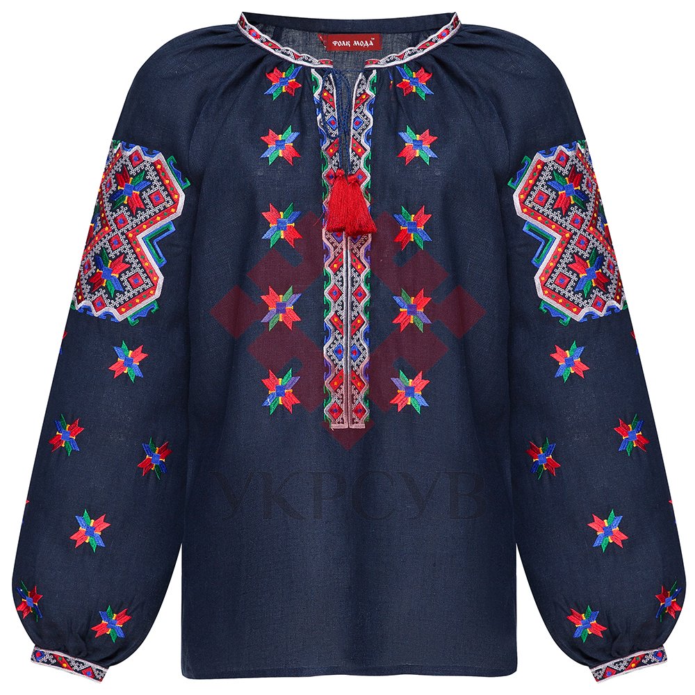 Жіноча вишиванка Фолк мода (7401)Жіноча вишиванка в синьому кольорі поєднала в собі давні традиції, сучасні тенденції та комфорт. Натуральна лляна тканина, акуратна машинна вишивка гляддю, дерев'яна фурнітура - визначає високу якість виробу. Візерунок, в основу якого покладений давній оберіг та символ - зірка-Алатир, розміщений спереду сорочки та на рукавах. Склад: льон/linen - 100% Прання: |