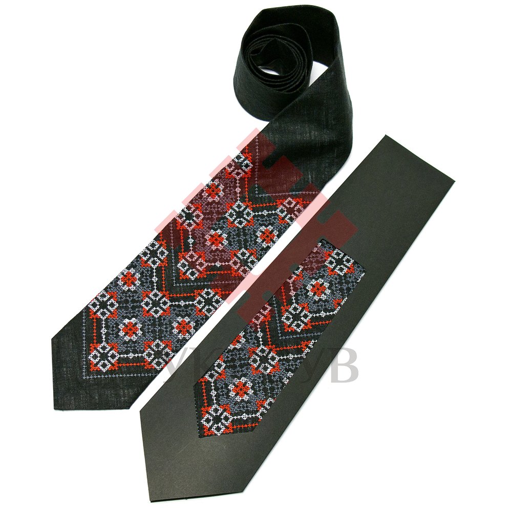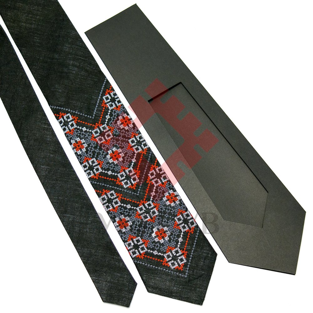 Всі вишиті краватки запаковані в ексклюзивну упаковку ручної роботи. Чорна фірмова упаковка виготовлена з дизайнерського картону. Упаковка добре тримає форму виробу, що дуже зручно при транспортуванні. Тому не важливо, хочете ви зробити чудовий фольковий подарунок знайомому чи самому собі, краватка з льону – це унікальний і дуже оригінальний вибір.