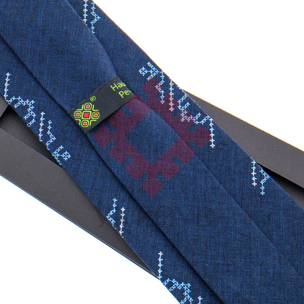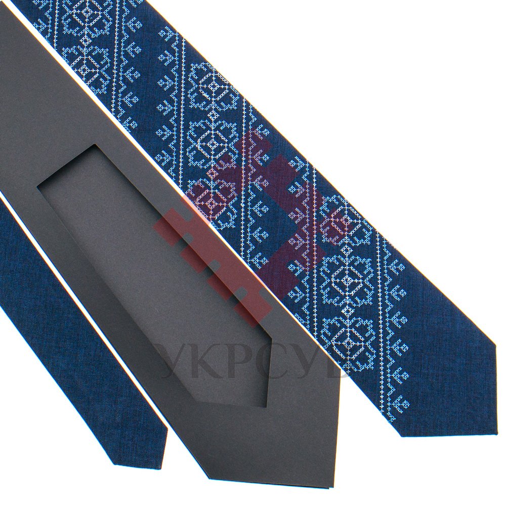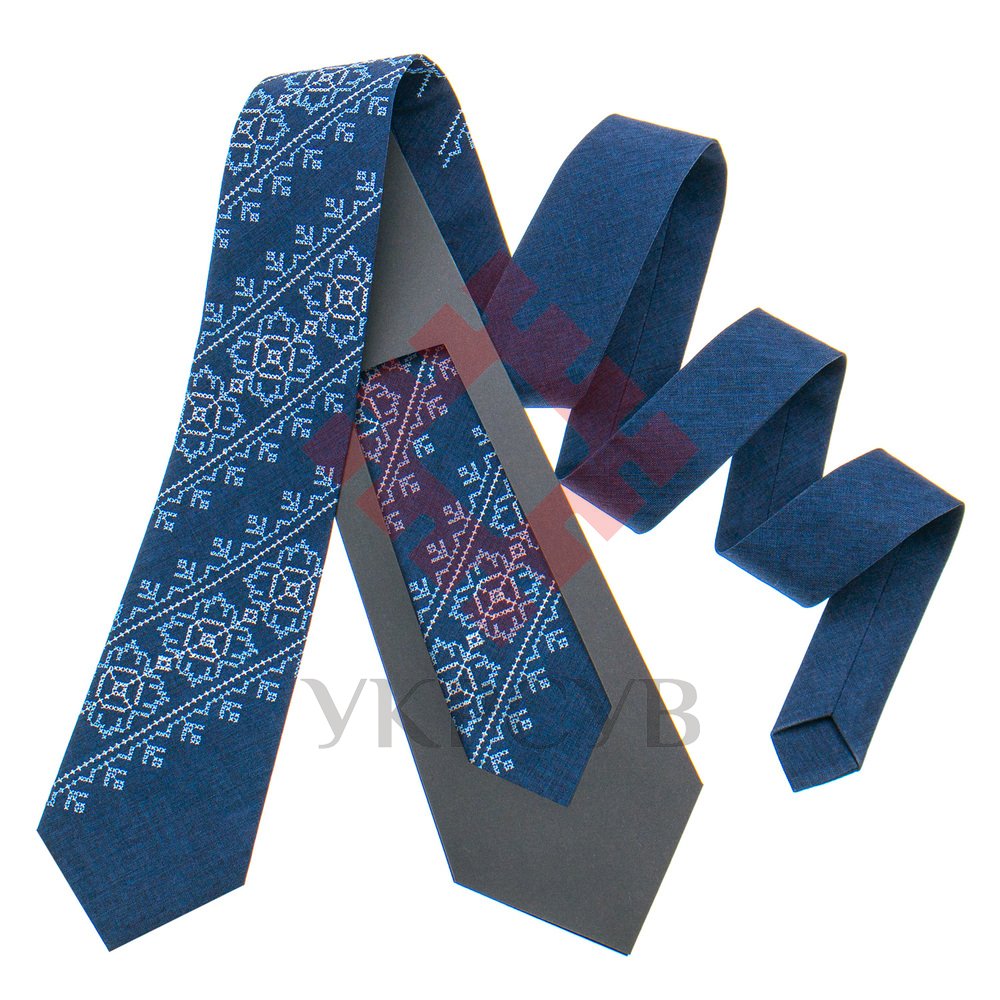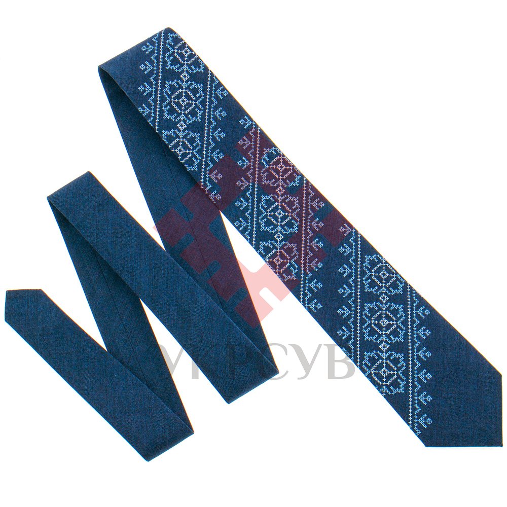 Матеріал краватки – костюмна тканина синього кольору. Довжина виробу – 145см. Дана серія викроєна у нашій фірмовій техніці поєднання тканин та вишитих елементів.