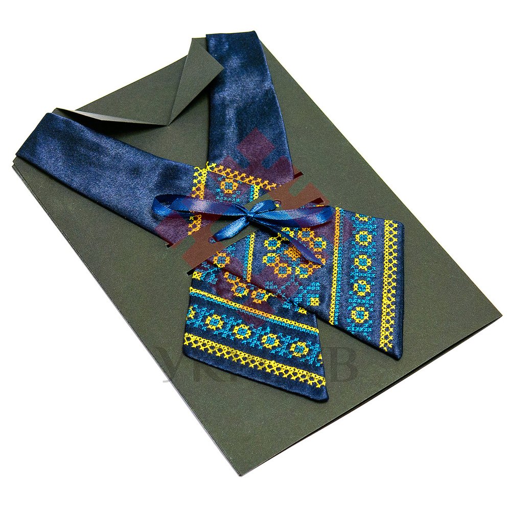 Декоративною особливістю виробу є стилізована вишивка, що розміщена по центру кроса (симетрично на обох деталях краватки). Краватка має застібку і регулятор, що дає змогу дуже швидкого і простого вдягання, тому аксесуар не потребує специфічних навичок зав'язування!