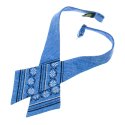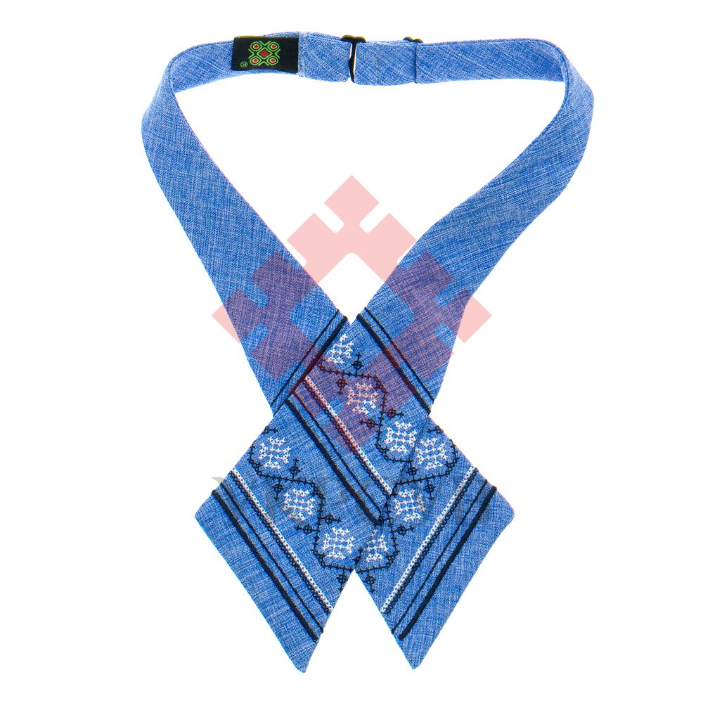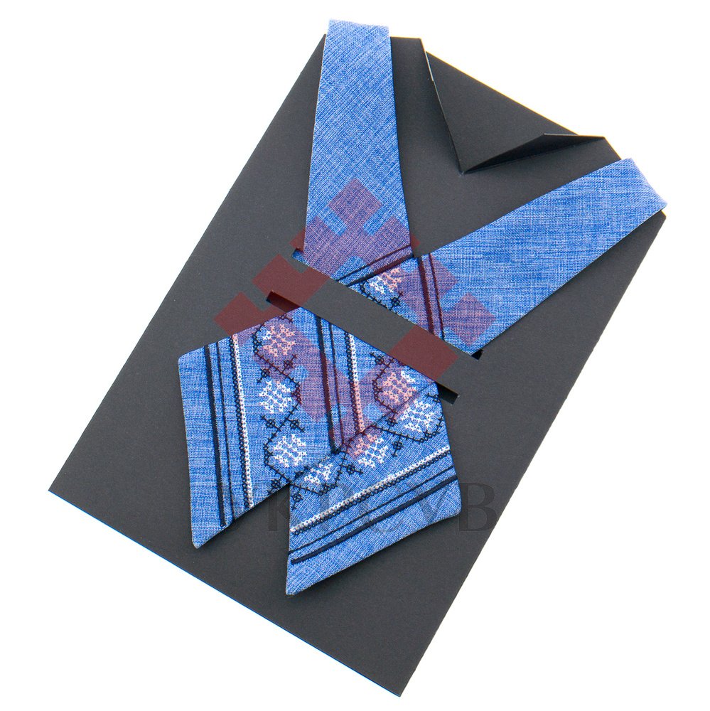 Вишита крос краватка №870 виготовлена з костюмної тканини волошкового кольору, оздоблена стилізованою українською вишивкою.