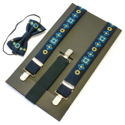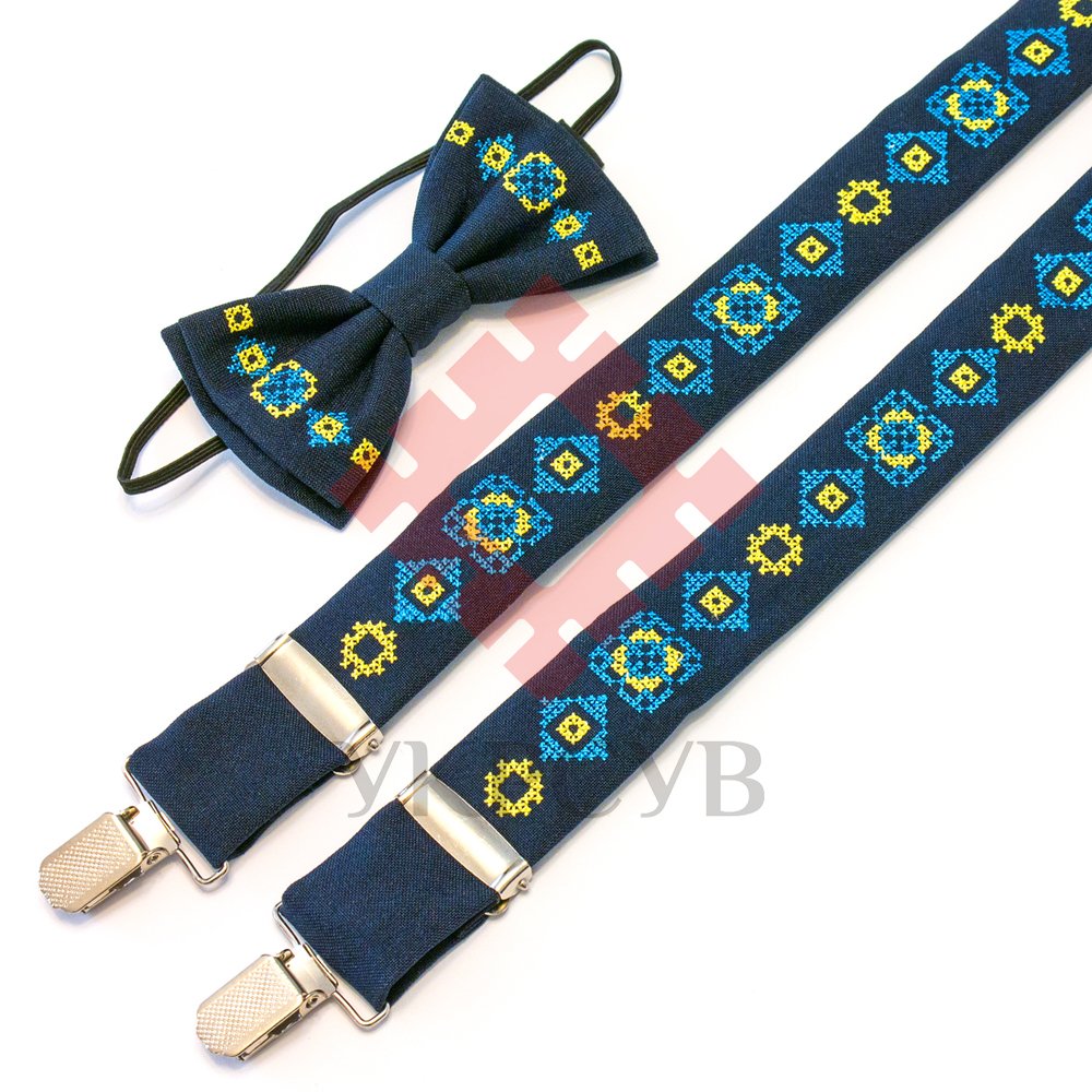 Дитячий вишитий набір складається з дитячих вишитих підтяжок і вишитого метелика. Матеріал виробів - костюмна тканина синього кольору.