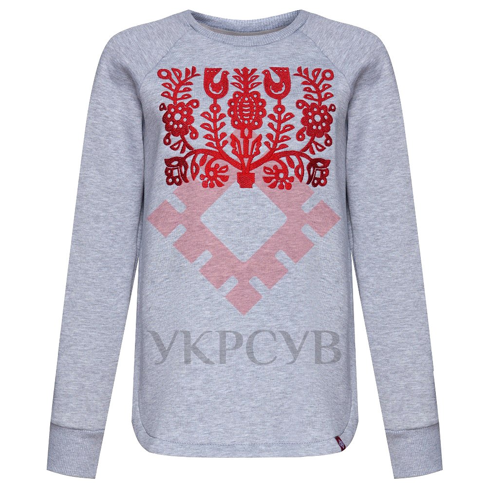Жіночий світшот із бордовою вишивкою — musthave цього сезону. Бордові візерунки гладдю ефектно виглядають на сірій тканині. Виріб є стійким до прання, не втрачає первинні кольори. Цей базовий світшот чудово поєднується із джинсами, шкіряними штанами, лосинами, шортами тощо.