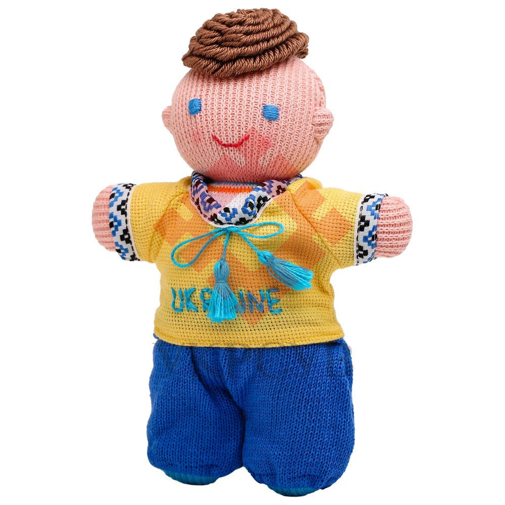 Лялька "Хлопчик Козачок", жовто-блакитний.Лялька Козачок/жовто-блакитний- в’язана іграшка з елементами ручної роботи. Козачок одягнений в жовту вишиванку і яскраві сині шаровари. Така іграшка буде чудовим сувеніром з України як для дорослого, так і улюбленою іграшкою для дитини. Іграшка виготовляється нашими майстрами вручну, тому кожна унікальна, наповнена любов'ю і турботою. Іграшка набита гіпоалергенним наповнювачем (силіконізоване волокно). Він добре зберігає форму, не деформується, не вбирає вологу і запахи, не є легкозаймистих матеріалів, довговічний в експлуатації, при праннях. Загальна інформація Матеріл: бавовна, любов