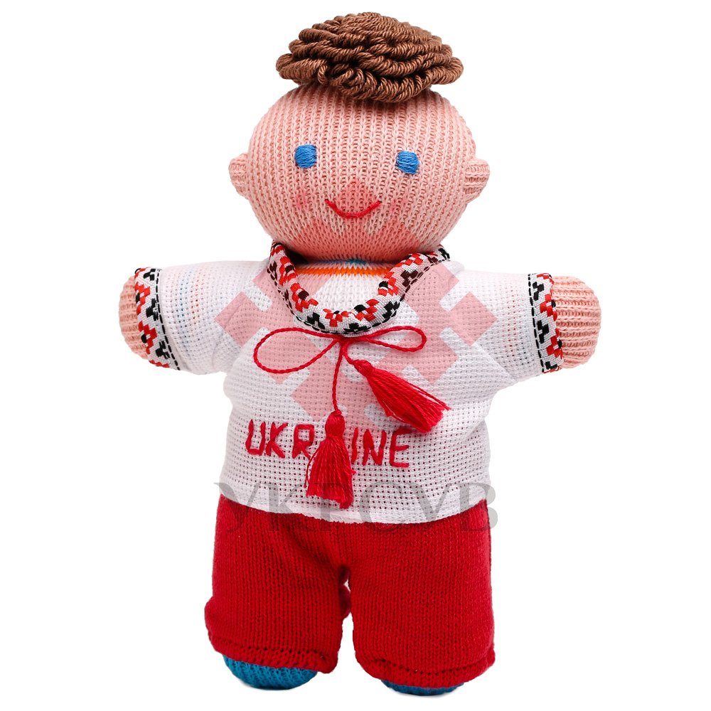 Лялька "Хлопчик Козачок", червоно-білий.Лялька Козачок /червоно-білий- в’язана іграшка з елементами ручної роботи. Козачок вдягнений в білу вишиванку і яскраві червоні шаровари. Така іграшка буде чудовим сувеніром з України як для дорослого, так і улюбленою іграшкою для дитини. Іграшка виготовляється українськими майстрами вручну, тому кожна унікальна, наповнена любов'ю і турботою. Іграшка набита гіпоалергенним наповнювачем (силіконізоване волокно). Він добре зберігає форму, не деформується, не вбирає вологу і запахи, не є легкозаймистих матеріалів, довговічний в експлуатації, при праннях. Загальна інформація Матеріл: бавовна, любов