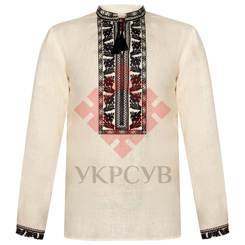 Сорочка чоловіча вишиванка Фолк мода (7002)Ця вишукана чоловіча вишиванка кольору натурального льону виконана за мотивами борщівської вишивки. Дана модель сорочки багата на різноманітні деталі: незвична квіткова вишивка гладдю, дерев'яні гудзики на манжетах, зручні зав'язки-китиці. Щоб придбати цю вишиванку достатньо лише обрати потрібний розмір та оформити замовлення. Загальна інформація Тканина: 100% льон Догляд: Прання: