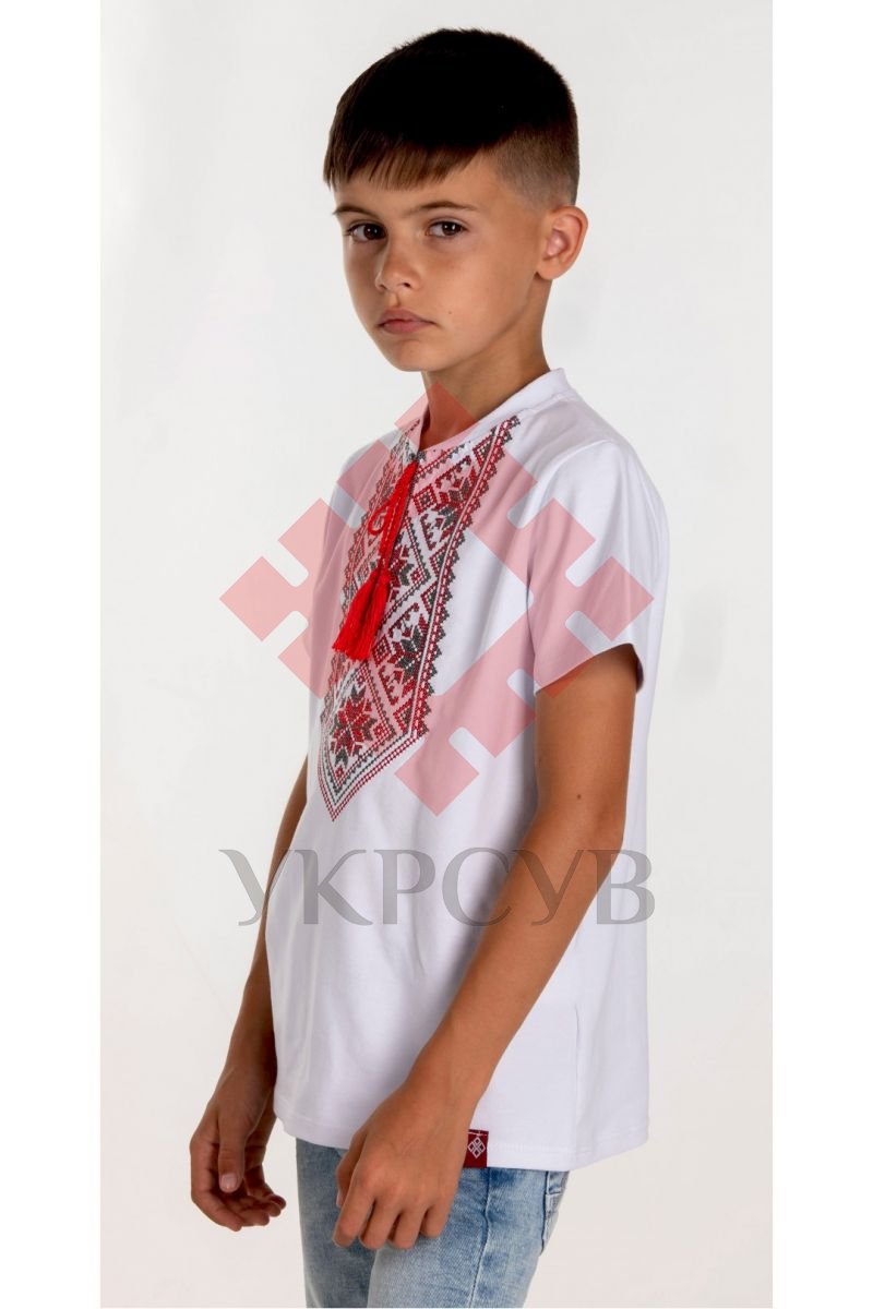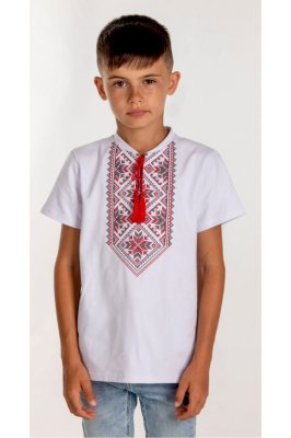 Футболка вишиванка для хлопчика Фолк Мода (6023)Дитяча футболка білого кольору з українською вишивкою личитиме кожній дитині. Зручний крій, якісні, безпечні матеріали, акуратна вишивка Вас приємно здивує. Український орнамент виконаний хрестиком червоними та чорними нитками.Загальна інформація Тканина: 95% - бавовна/cotton 5% - поліестер/polyesterКолір тканини: білий Вишивальна нитка: віскозна Довжина рукава: короткий Техніка виконання вишивки: хрестик Догляд: Прання: