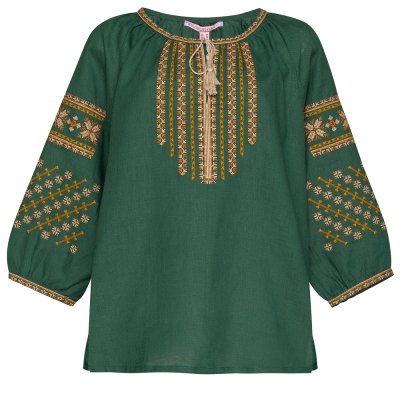 Блуза вишиванка "Слобожанка" - Богуслава чарына, зелений льонВишиванка виготовлена з натурального льону насиченого зеленого кольору: це символ народження, зростання та процвітання. Кольори вишивки – золотавий, коричневий та помаранчевий. Акуратна вишивка хрестиком розміщена спереду вишиванки та на рукавах. Модель оснащена китицями на зав'язках. Характер орнаменту: геометричний Загальна інформація Виготовлено в Україні. Догляд: Прання: