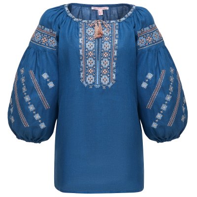 Блуза вишиванка жіноча Милослава - СлобожанкаВишиванка синього кольору: це символ ніжності, легкості та спокою. Кольори вишивки – блакитний, золотавий. Блакитний - це колір небосхилу і води. Є символом очищення, душевного спокою та позбавлення від хвороб. Золотавий колір символізує достаток та багатство. Характер орнаменту: геометричний. Загальна інформація Тканина: льон |