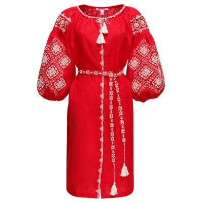 Сукня вишиванка "Слобожанка" - Іванна (червоний льон)Сукня червоного кольору: цей колір вишиванки символізує любов, пристрасть, повноту життя і красу. Колір вишивки - бежевий. Символіка: ромб - символ родючості і жіночого начала. Орнаменти з ромбами є сильним захисним оберегом, приносять удачу. Згідно з давньою слов'янською культурою, ромби представляють богиню Землі, яка сприяє родючості. Загальна інформація Тканина: льон Догляд: Прання: