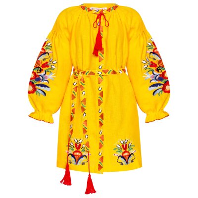 Сукня для дівчинки "Слобожанка" - Сона, жовтаСукня з натурального льону яскраво-жовтого кольору. Родзинкою цієї моделі є пишні рукава, розшиті яскравою кольоровою квітковою вишивкою. Характер орнаменту: рослинний Загальна інформація Тканина: Льон Догляд: Прання: