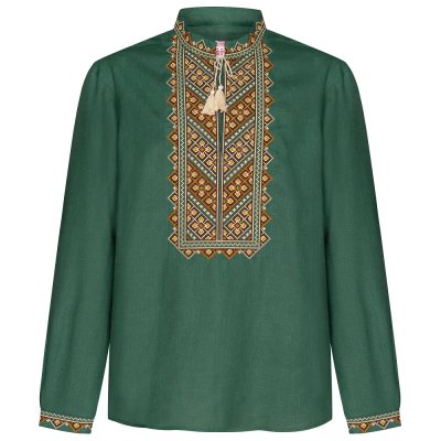 Сорочка вишиванка чоловіча Слобожанка - БажанВишиванка виготовлена з натурального льону насиченого зеленого кольору: це символ народження, зростання та процвітання. Кольори вишивки – золотавий, коричневий та помаранчевий. Акуратна вишивка хрестиком розміщена спереду вишиванки, на комірці та манжетах. Модель оснащена китицями на зав'язках. Характер орнаменту: геометричний Символіка: Ромб - ромб один з найпопулярніших орнаментів, втілюють за старовинними повір'ями богиню землі. Вважається дуже сильним охоронним знаком, що дарує щастя і родючість. Загальна інформація Виготовлено в Україні. Догляд: Прання: