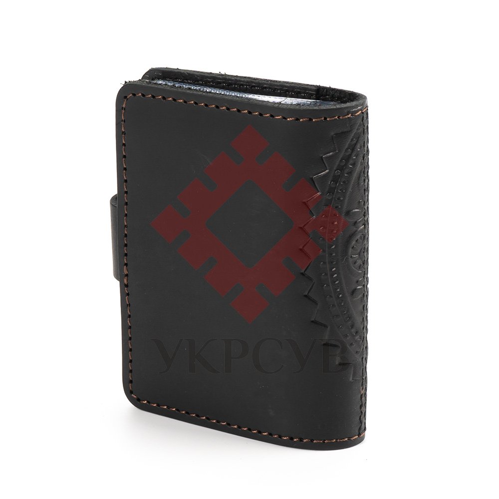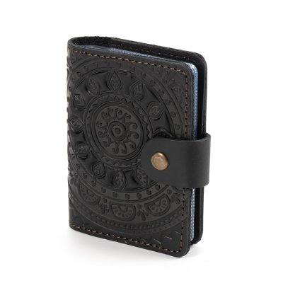 Візитниця "Сонечко", чорнаОбкладинка виконана з натуральної шкіри з тисненням орнаменту. Ця візитниця буде надійно зберігати візитки, дисконтні або кредитні картки.Загальна інформація Матеріл: 100% шкіра |