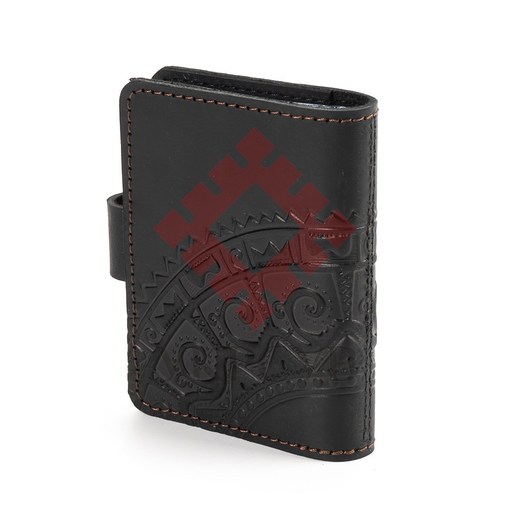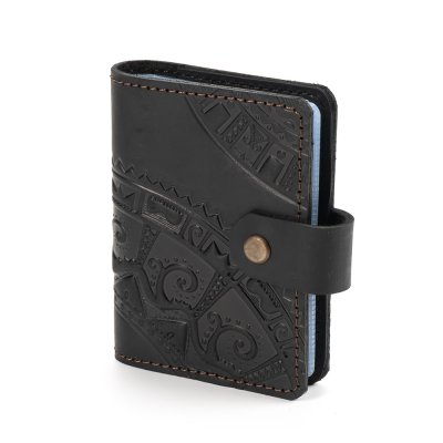 Візитниця "Півкола", чорнаОбкладинка виконана з натуральної шкіри з тисненням орнаменту. Ця візитниця буде надійно зберігати візитки, дисконтні або кредитні картки.Загальна інформація Матеріл: 100% шкіра |